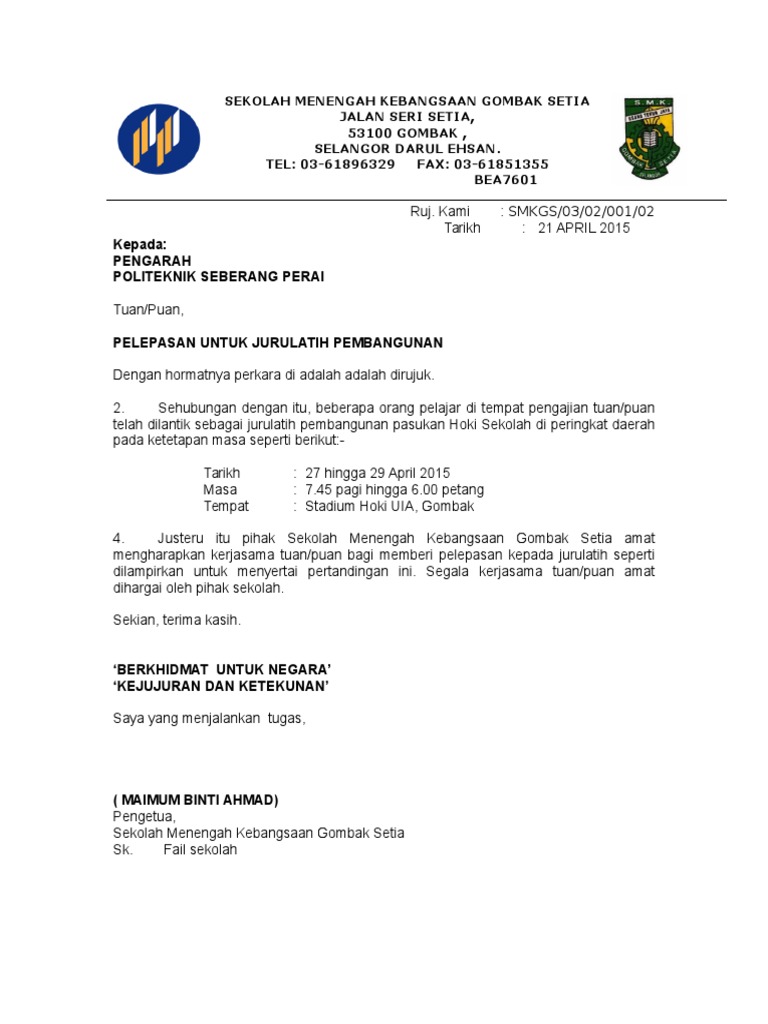 Contoh surat pelepasan nama pelajar rumsis kolej teknologi islam antarabangsa melaka. Contoh Surat Rasmi Pelepasan Pkp. Surat pelepasan kuliah bagi jawatankuasa karnival permainan tradisional IPGKDA.